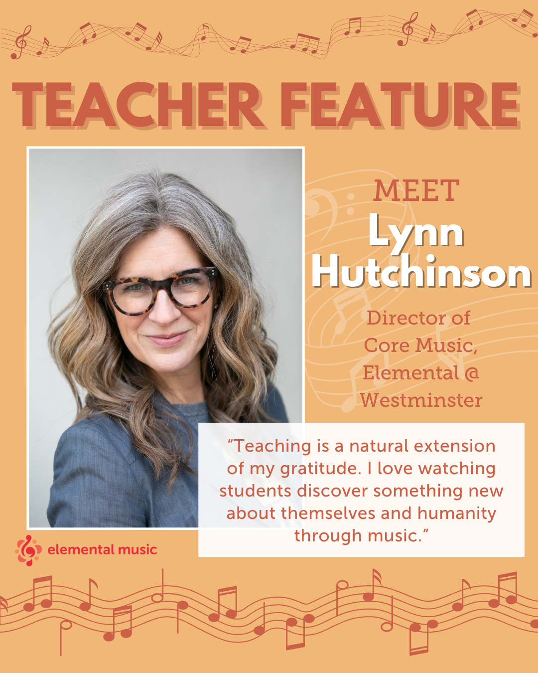 This month, we are featuring Lynn Hutchinson who directs our Core Music program for Elemental @ Westminster. Lynn has held many roles in our organization. As the parent of an Elemental Music student, a former board member, and now a teacher in our programs, she understands Elemental Music from every angle! We are excited for you to get to know Lynn - pianist, composer, arranger, and music teacher extraordinaire!
